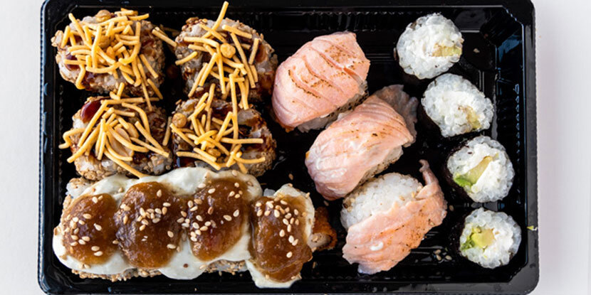 Combo de 4 uramakis de queso con salmón y salsa teriyaki, 4 uramakis de pollo con mermelada de piña y salsa de queso al estilo dáci sushi, 3 mini onigiri de queso mascarpone y salmón flameado y 4 Makis de aguacate con filadelfia.