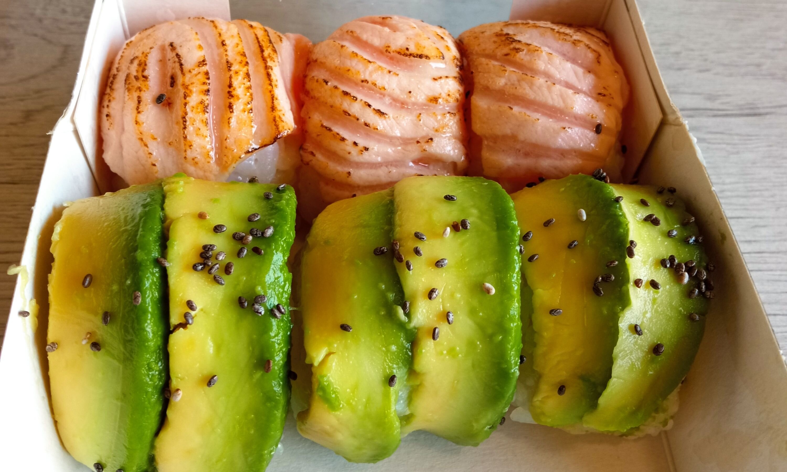 Caja de 6 bolitas de arroz. 3 bolitas de ellas rellenas con queso mascarpone y nigiris de salmón flameado + 3 bolitas más de arroz de sushi con nigiris de aguacate y aderezo de miso al estilo de D´aci sushi y semillas de Chia.