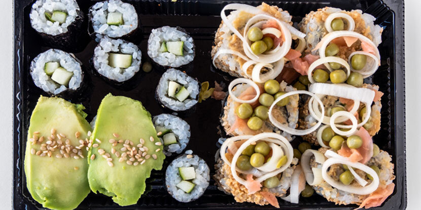 Si te gustan los vegetales esta es tu tabla. Dispone de 6 Uramakis de vegetales con mango, un toque de lima y nuestra nueva aderezo de miso D´aci Sushi.