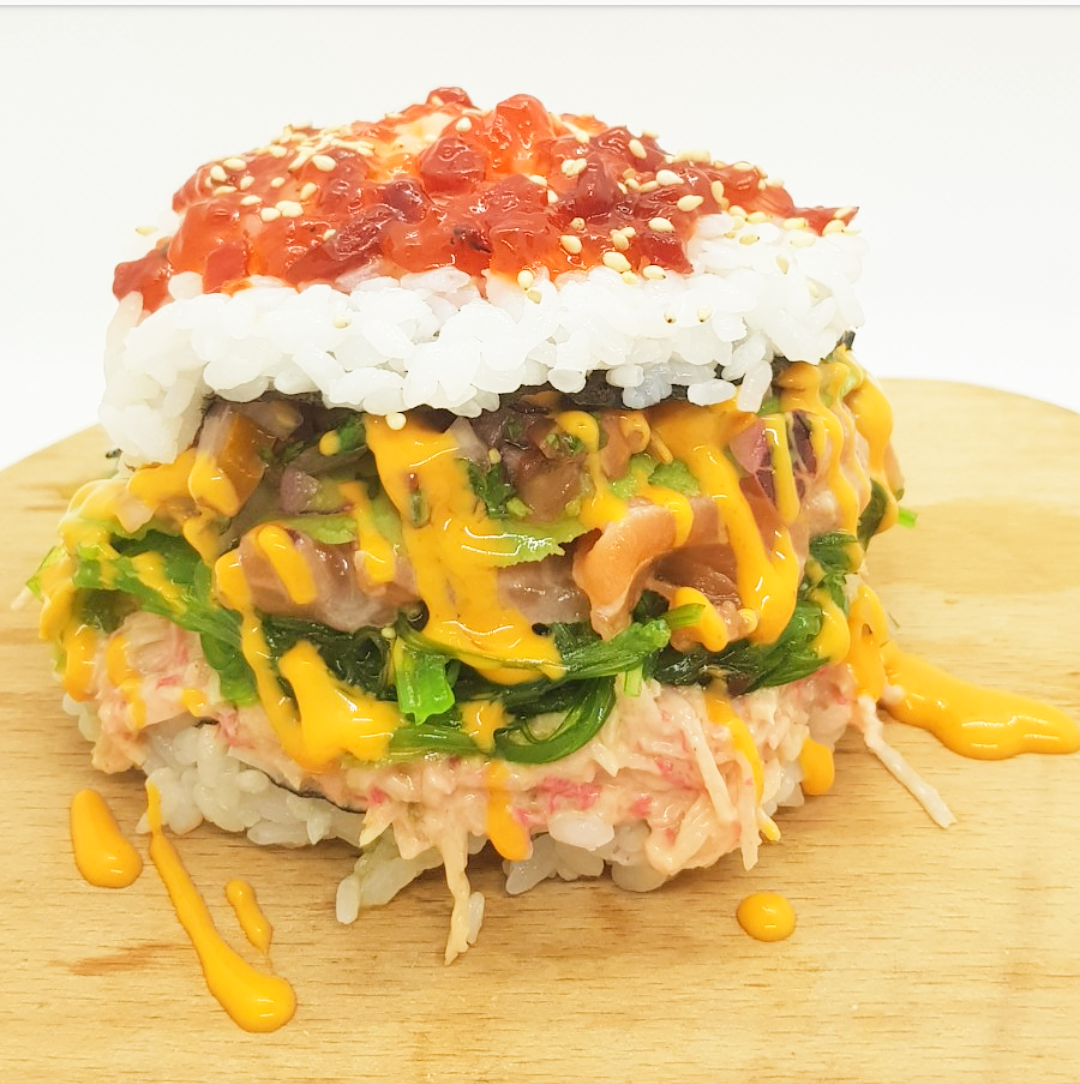 Hamburguesa con arroz y nori, cangrejo, wakame, aguacate, pico de gallo mexicano, salsa semipicante, mermelada de pimiento y salmón puedes pedirlo crudo o cocido.