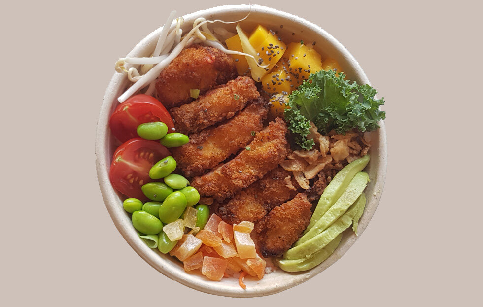 Nuevos Poke bowl, los platos más healthy y equilibrados de D'aci Sushi. Puedes pedirlos con arroz de sushi o con tallarines. El poke de Pollo se compone de pollo rebozado, mango,aguacate, edamame, tomate cherry, papaya deshidratada, brotes de soja, kale y cebolla crujiente, puedes pedirlo con la base de arroz de sushi o con tallarines. La salsa que lo acompaña puede ser nuestra salsa tropical o salsa mediterranea.