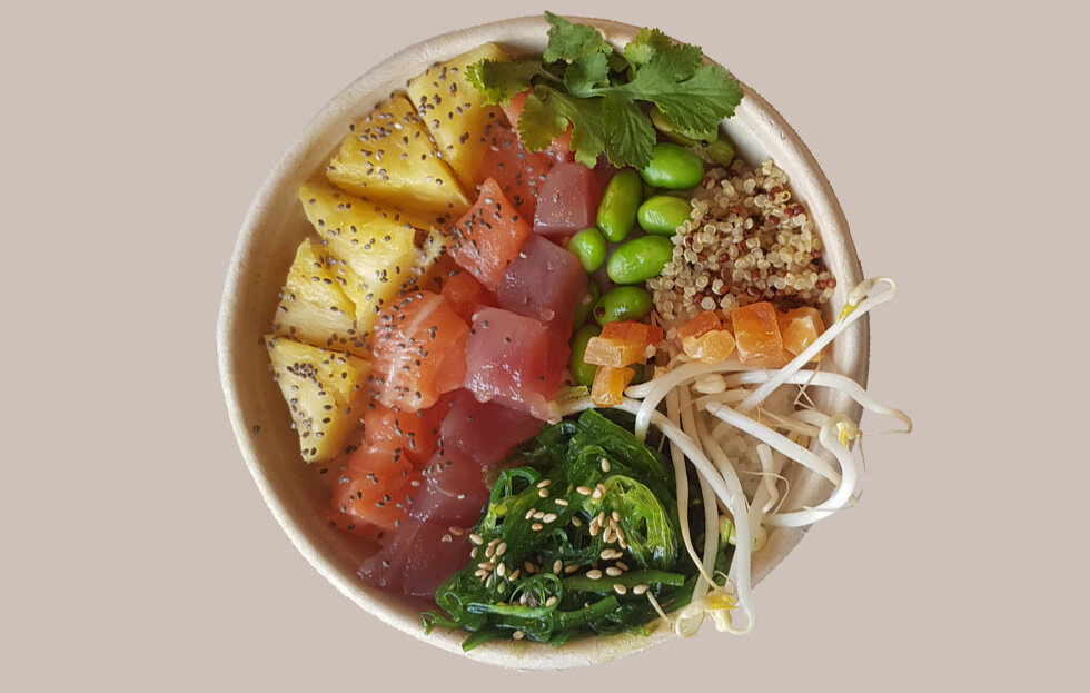Nuevos Poke bowl, los platos más healthy y equilibrados de D'aci Sushi. Puedes pedirlos con arroz de sushi o con tallarines. El poke de Salmón y atún se compone de piña, salmon,atun,wakame,brotes de soja, papaya deshidratada, quinoa,edamame y cilantro, puedes pedirlo con la base de arroz de sushi o con tallarines. La salsa que lo acompaña puede ser nuestra salsa tropical o salsa mediterranea.