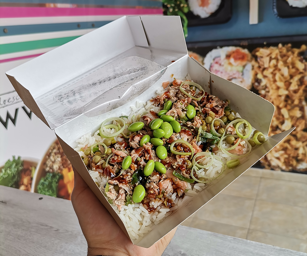 Delicioso salmon cocino macerado y cocido al estilo Dáci sushi con una base de arroz cocido sin sal , mix de puerro con guidantes y mukis de soja.