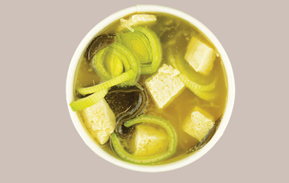 Sopa de miso con tofu, puerro, algas, noodles, jengibre y sesamo.