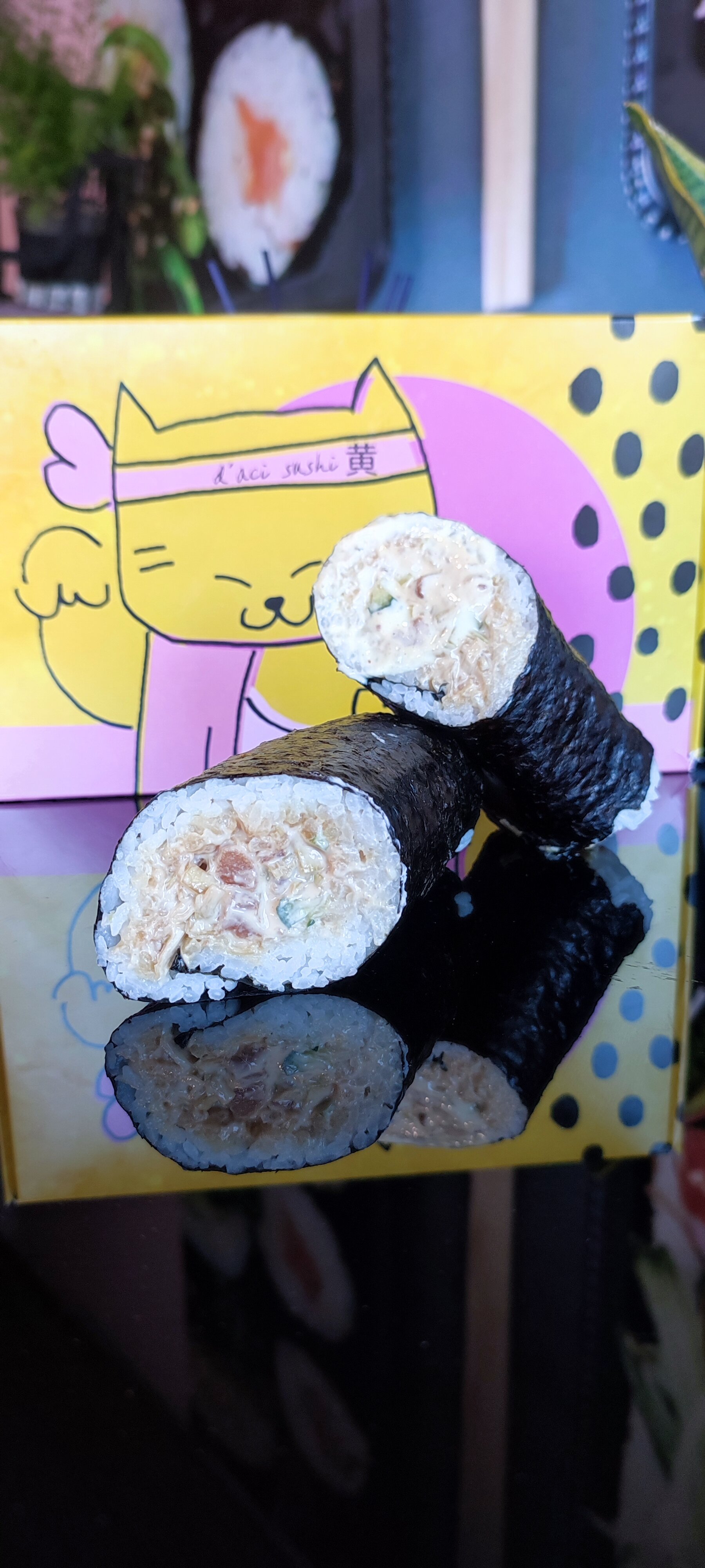 Gran sushiburrito de salmon con salsa jushi aguacate y pepino.